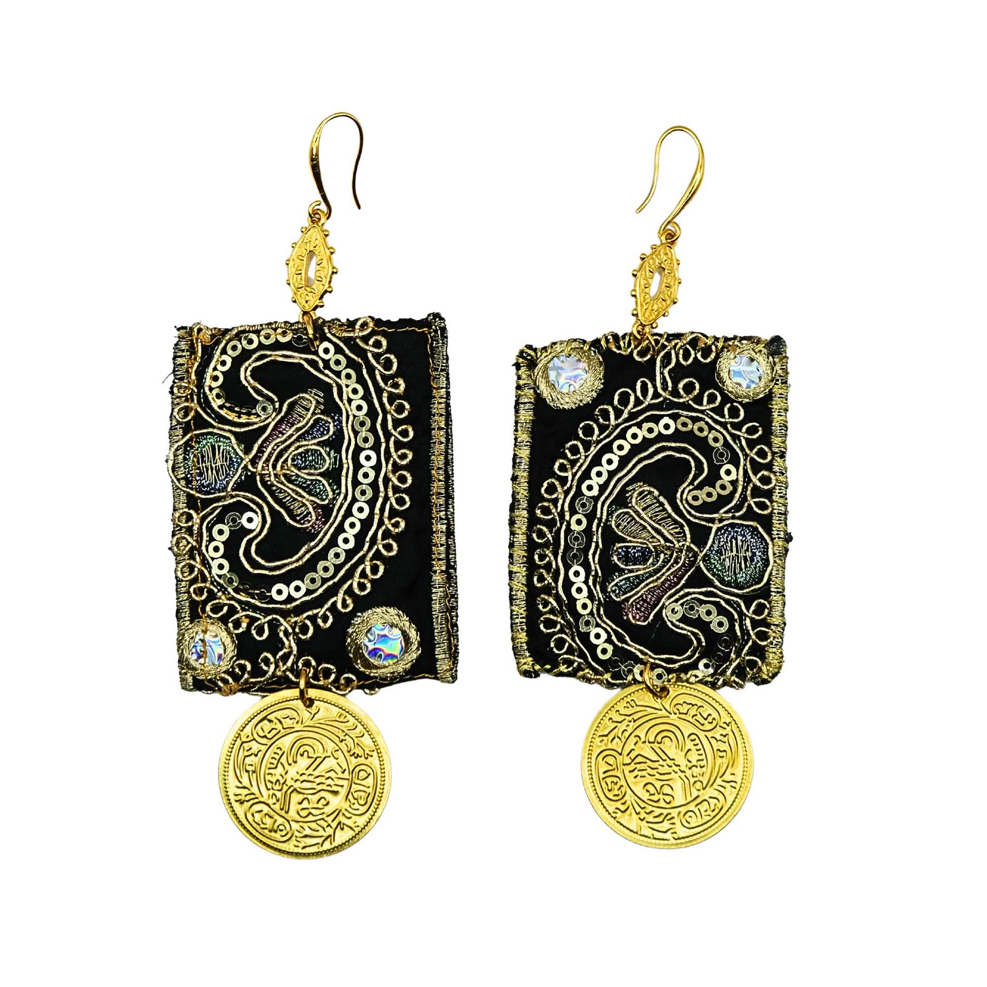 ※ handmade earrings from fabric decorated with metallic heart motif and metallic coin