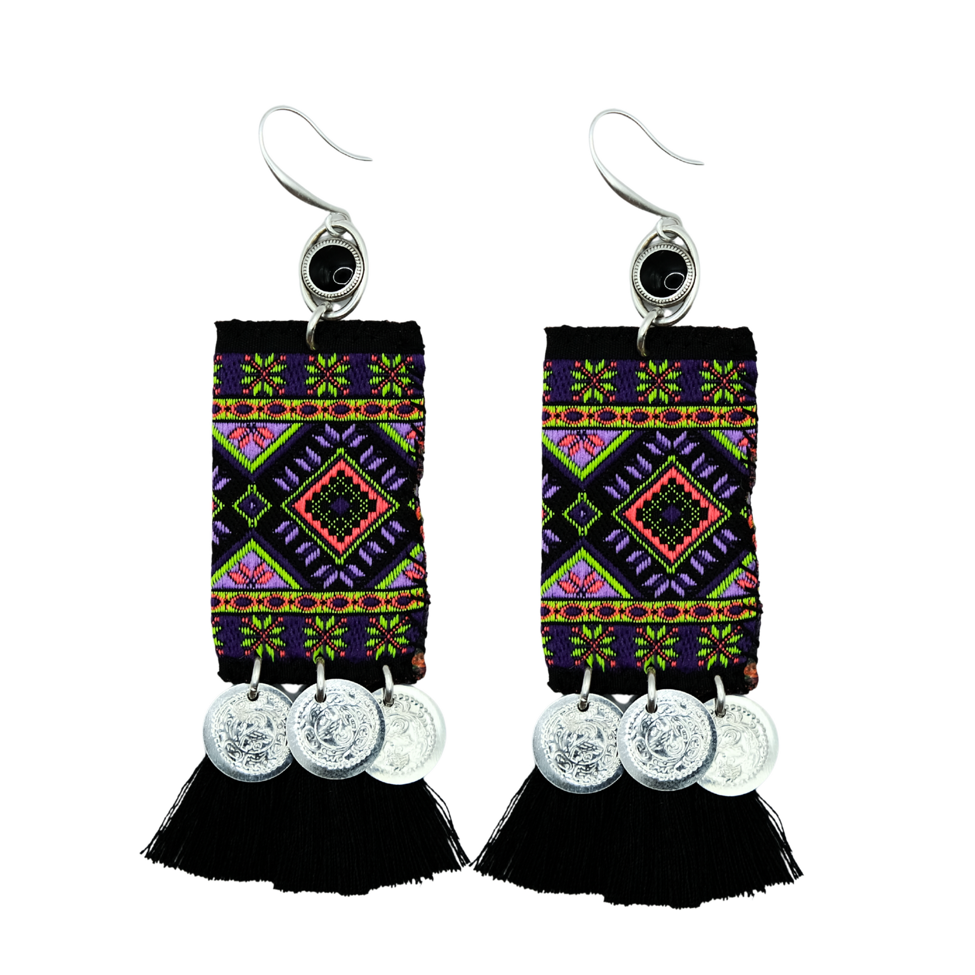※ handmade earrings with fabric decorated with tassels and metallic coins